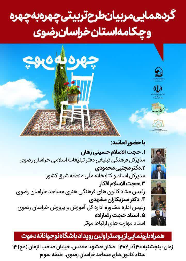"طرح چکامه و چهره به چهره" با حضور اساتید مشهدی با مشارکت ستاد کانون های مساجد خراسان رضوی و به منظور پیشگیری از گسترش آسیب‌های اجتماعی در مشهد مقدس اجرا می شود.