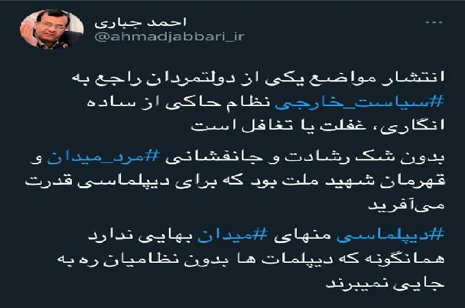 تابناک-احمد جباری نماینده مردم غرب هرمزگان با انتشار توئیتی به صوت لو رفته وزیر امور خارجه کشور واکنش نشان داد.